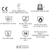 • Prenda de protección de alta visibilidad contra calor llamasoldeo, frío, riesgos térmicos producidos por un arco eléctrico y con propiedades electrostáticas.