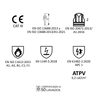 EPI destinado a la señalización de la presencia diurna y nocturna del usuario en situaciones de peligro de baja visibilidad y destinado a la protección del torso y extremidades superiores del usuario, con excepción de cabeza y manos, contra riesgos térmicos de inflamabilidad, calor convectivo, calor radiante, calor por contacto, contra riesgo de acumulación de cargas electrostáticas y contra riesgos térmicos de un arco eléctrico de 4 kA (APC 1).