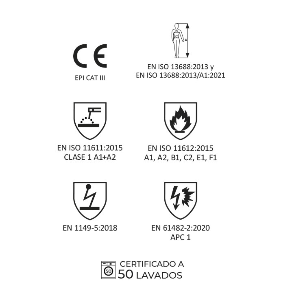 • EN ISO 11611:2015 Clase 1, A1+A2