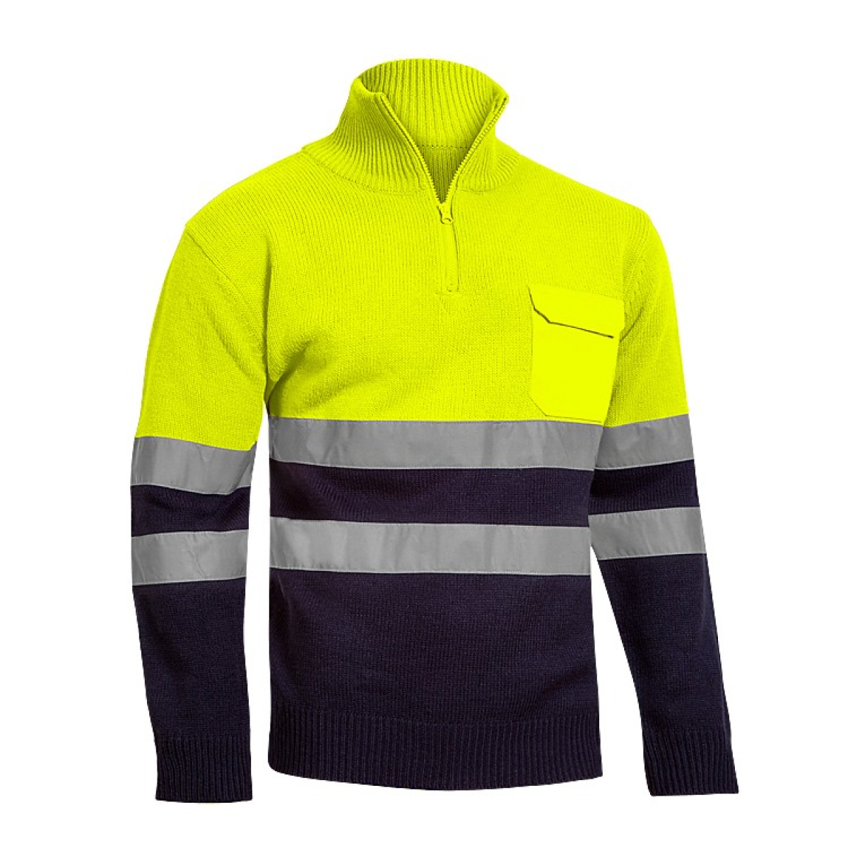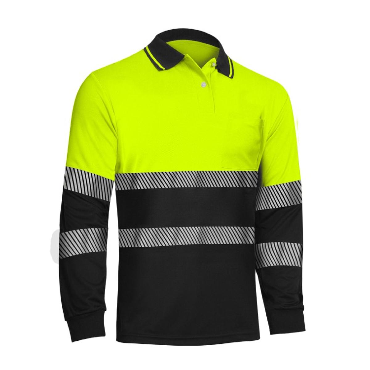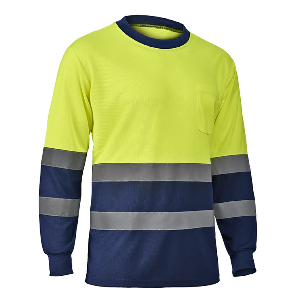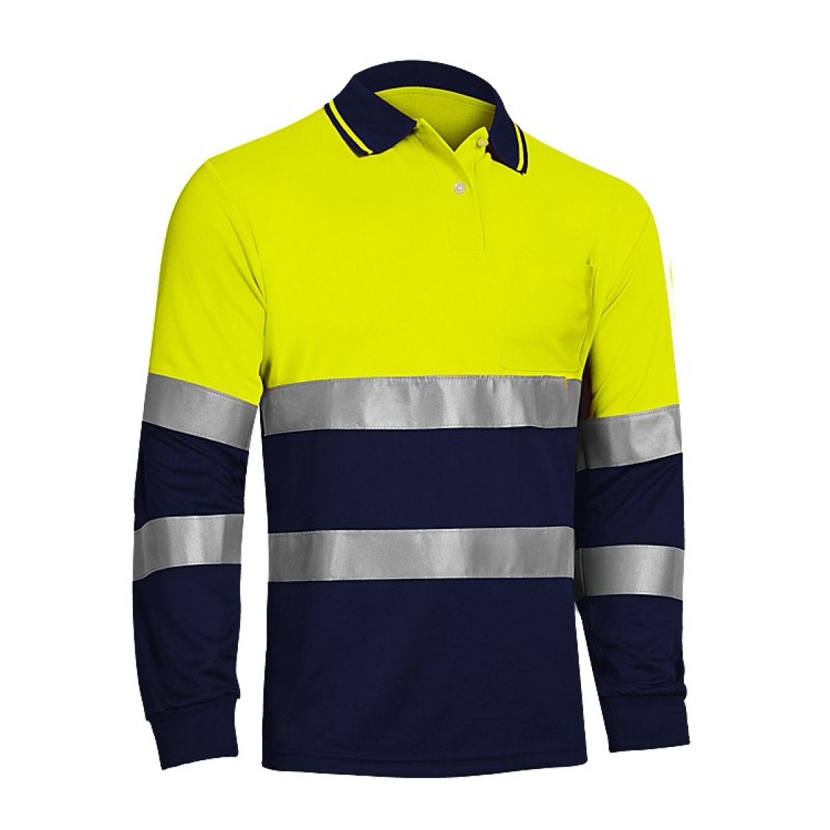• Dos bandas retro reflectantes segmentadas de color gris-plata y 50mm de ancho alrededor del torso, mangas y en el canesú sobre los hombros.