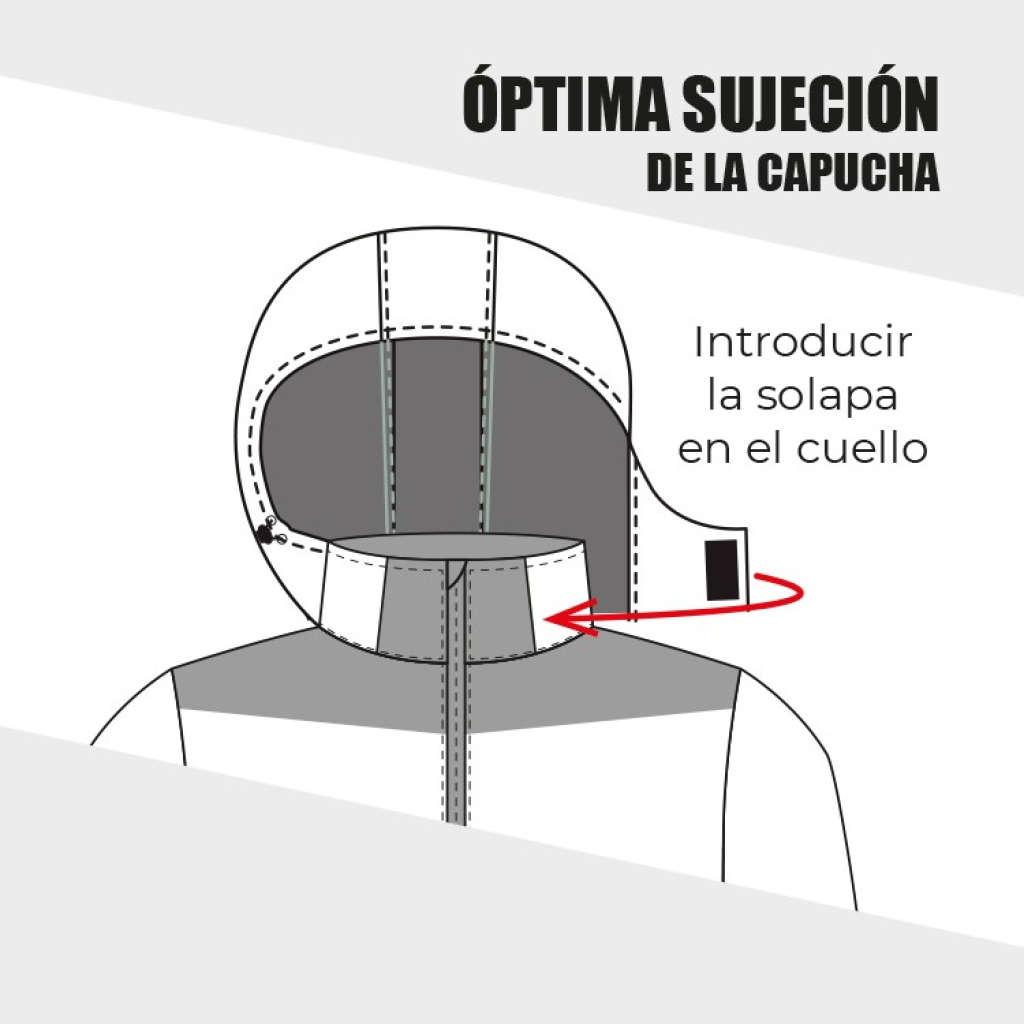 • Capucha oculta en el cuello con cierre con cinta autoadherente.Óptima sujeción al introducir la solapa por el cuello.
