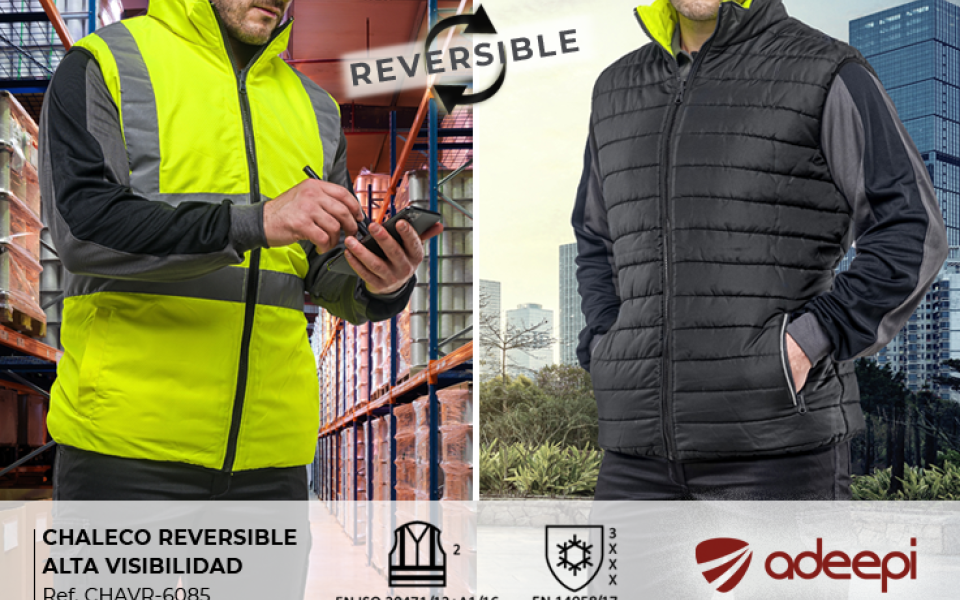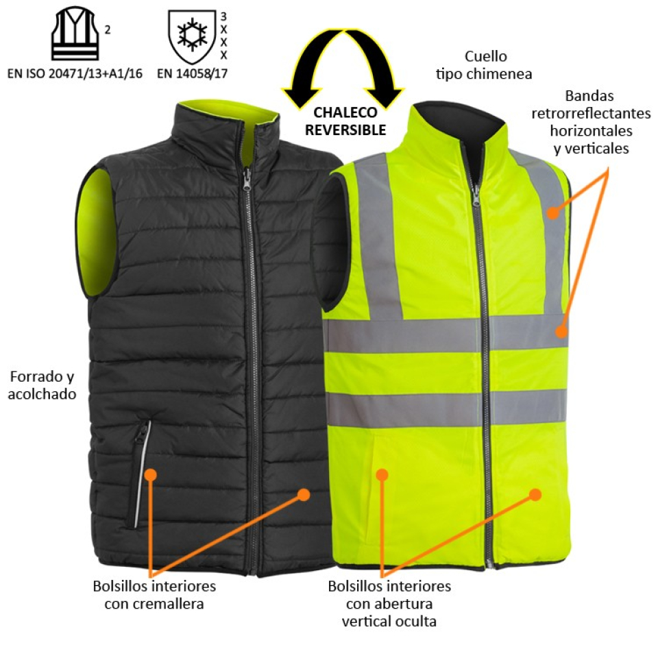 Práctico chaleco laboral reversible válido para diferentes usos. La clase 2 en alta visibilidad (EN20471) hace que el usuario sea visible de forma correcta en situaciones de riesgo, además de sentirse protegido del frío ya que este chaleco de trabajo ligero está también certificado en la norma de protección contra de frío EN14058.