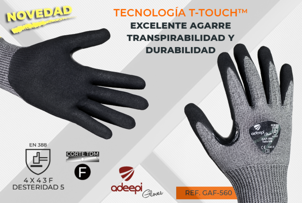 Recubrimiento en tecnología T-Touch, combinando un excelente agarre, incluso en mojado o aceitoso, con transpirabilidad para mayor confort de la mano.