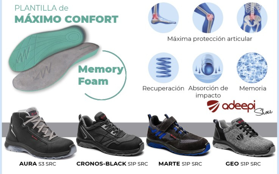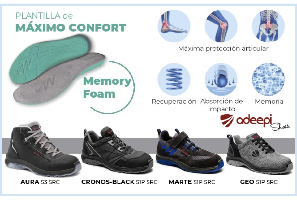 Estas extraordinarias propiedades adaptativas son idóneas para el calzado laboral aportando al usuario máxima protección articular y comodidad.