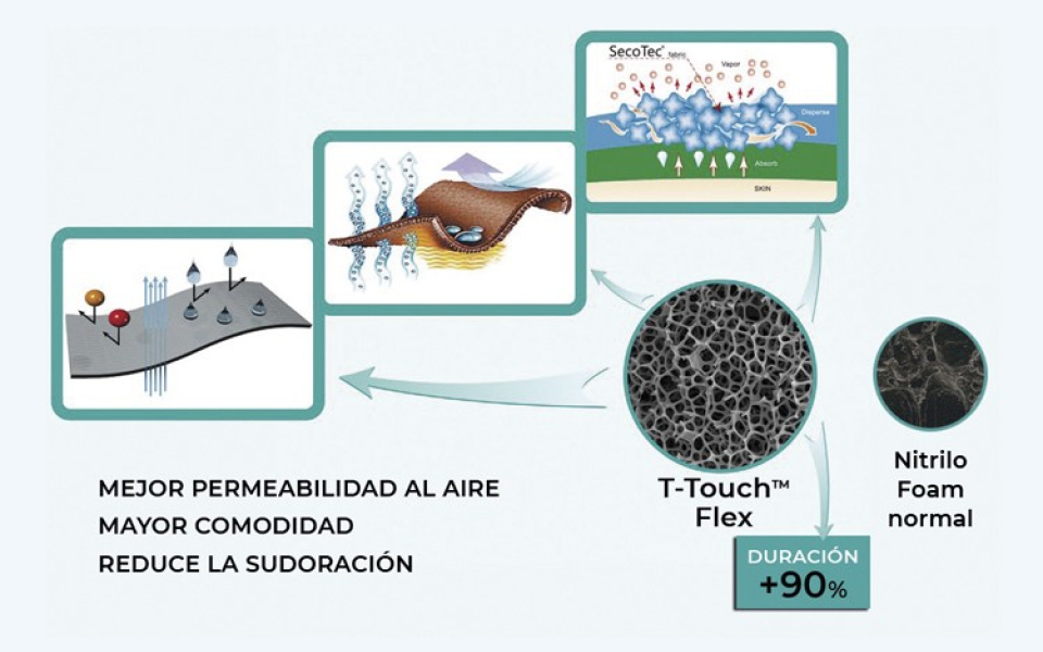 Esa transpirabilidad también se aprecia gracias a la tecnología multicapa nitrilo/PU microfoam T-Touch Flex ®, que también permite la permeabilidad del aire por la zona del recubrimiento.