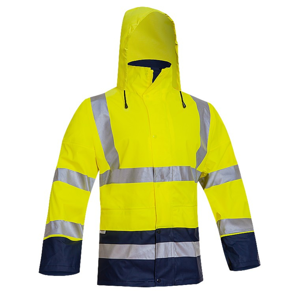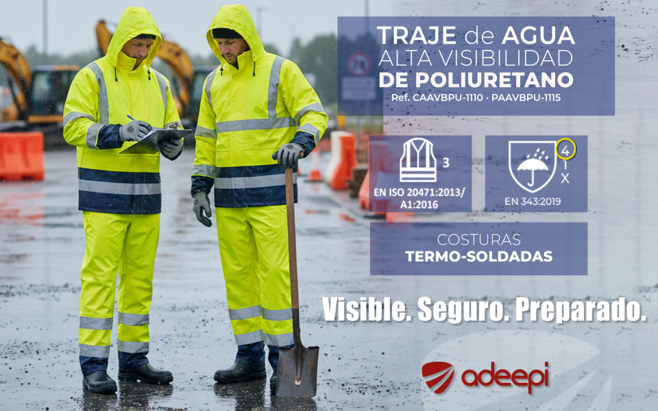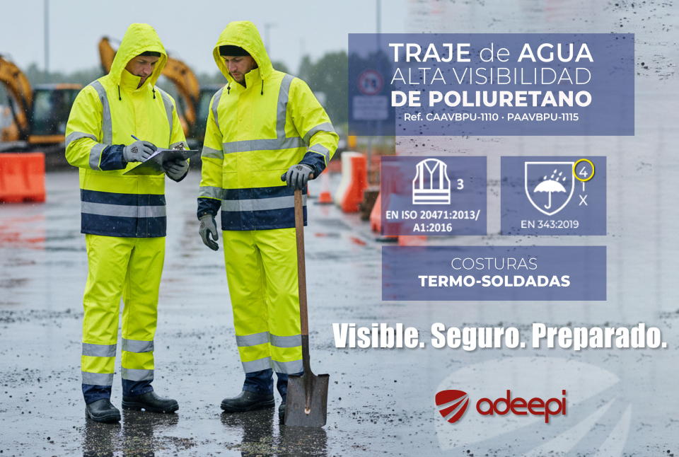 El traje de agua de alta visibilidad de ADEEPI es el complemento ideal para afrontar los días con lluvia intensa o moderada, donde puede disminuir la visibilidad. El PoliUretano es una material impermeable, pero su elasticidad permite una mayor comodidad en comparación a otros materiales. Permite también que las costuras se puedan termosoldar, asegurando una estanqueidad plena. El color marino en las zonas de mayor uso combina perfectamente con un nivel de visibilidad máximo.