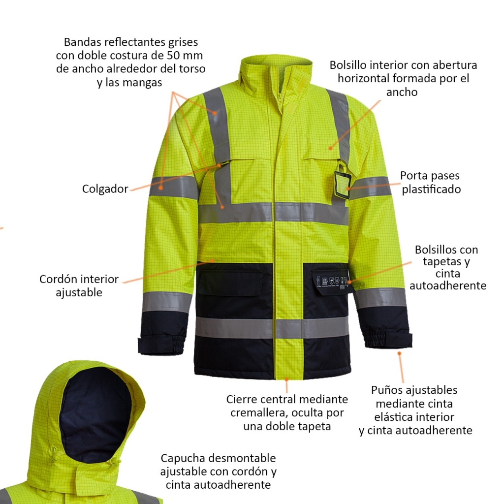 • Duas faixas horizontais retrorreflectoras à volta do tronco e das mangas, e duas faixas verticais que vão desde a faixa superior até aos ombros.