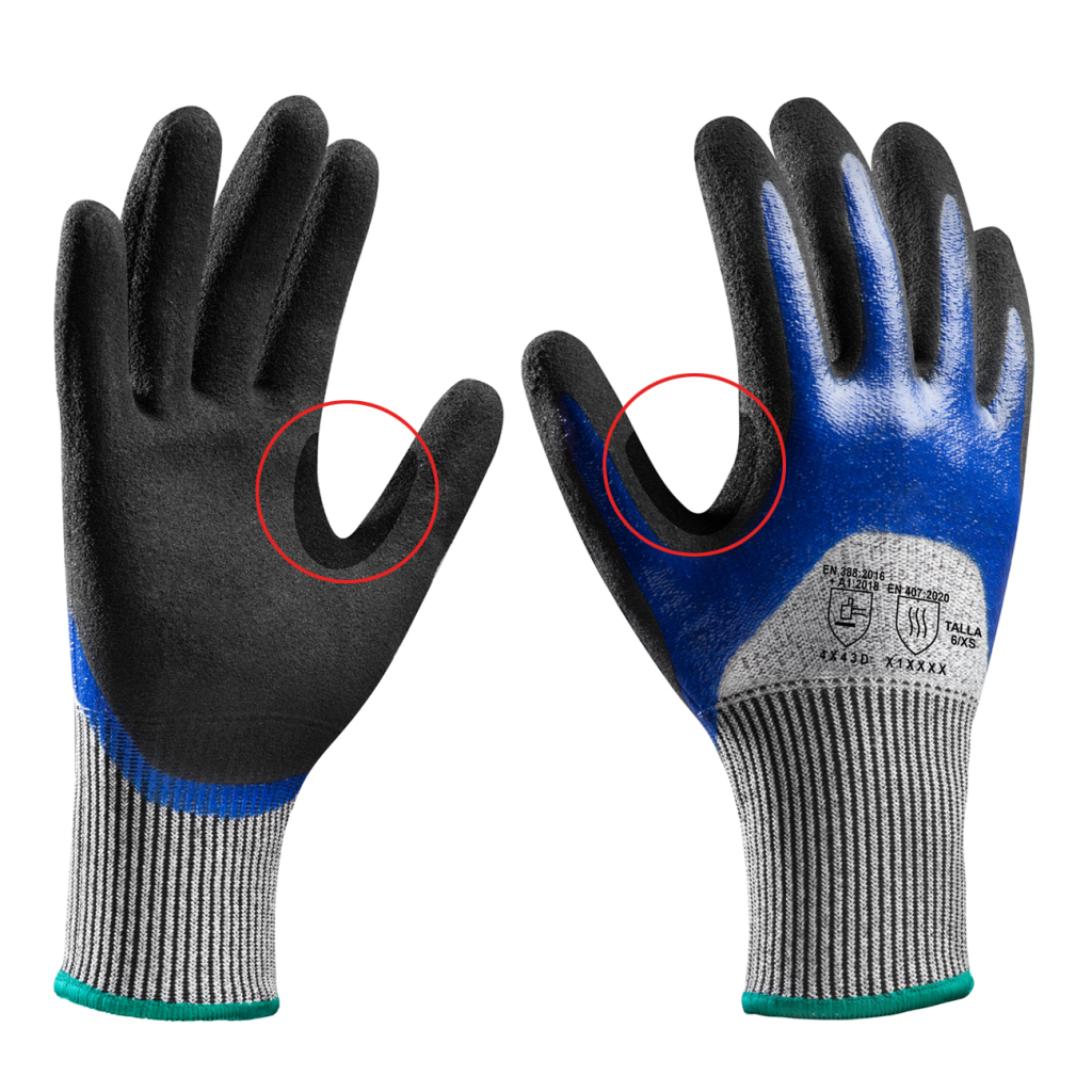 • Interior da palma e ¾ do dorso em nitrilo para impermeabilização.
