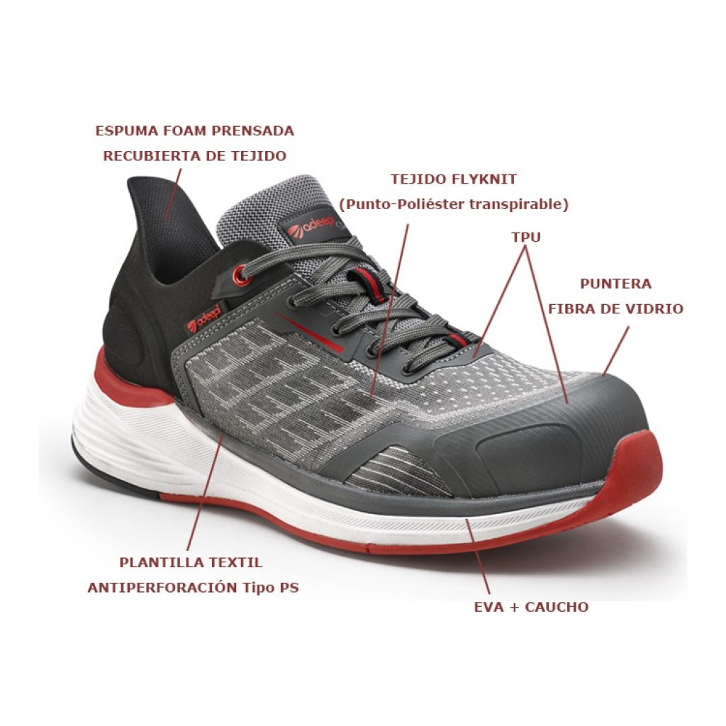 • S1PS incluye: calzado base + zona de tacón cerrada + antiestático (A) + absorción de energía en el tacón (E) + suela resistente a la perforación (planta no metálica tipo PS).