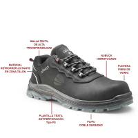 • Plantilla interior: Plantilla PU FOAM con acolchado PORÓN en zona talón e hilo antiestático. Antibacterias, antihongos. Forrado textil transpirable en cara superior.
